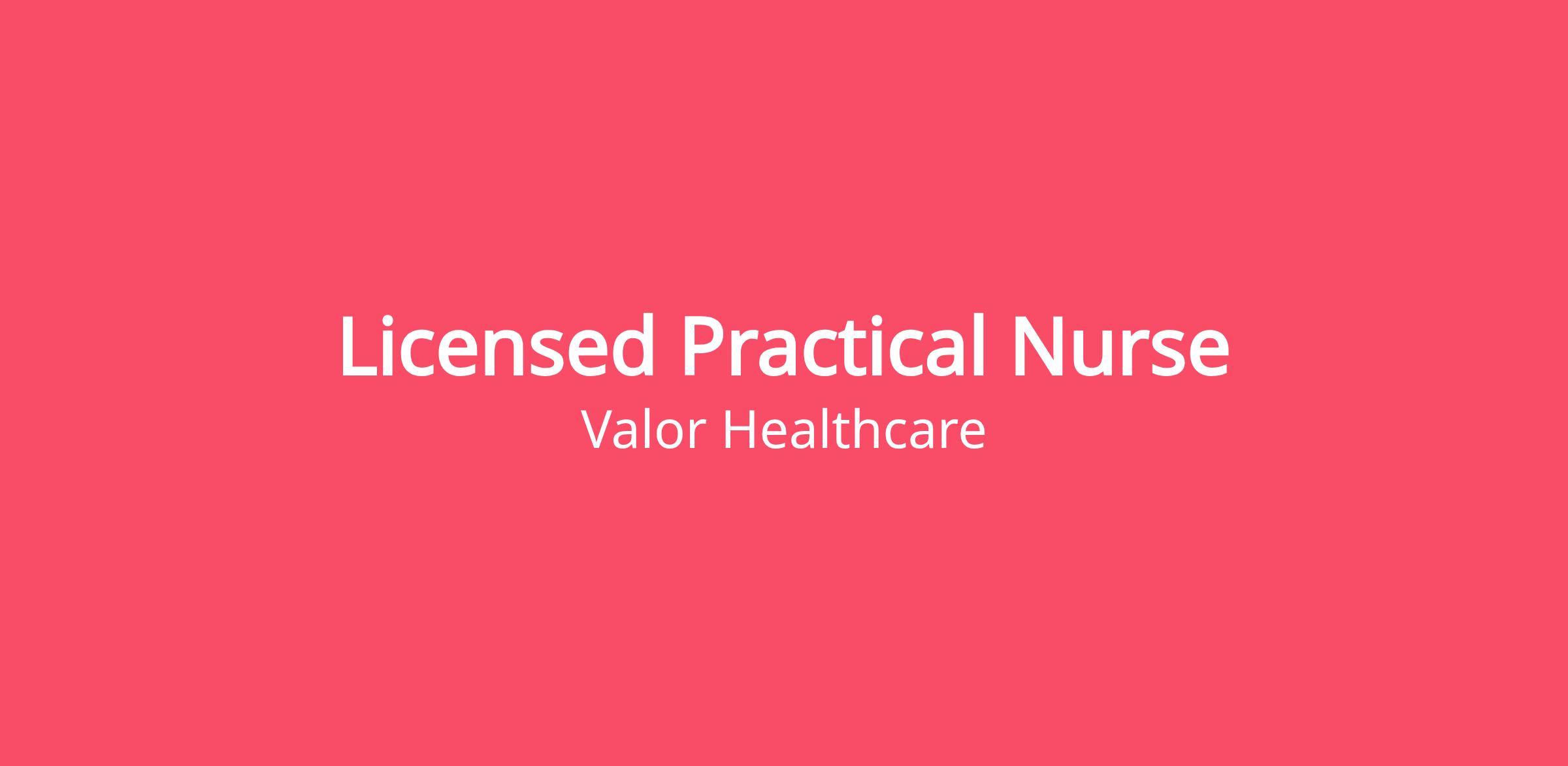 Valor Healthcare is looking for a passionate Licensed Practical Nurse to join our team at the Community Based Outpatient Clinic (CBOC) in Lockport. In exchange for your dedication and experience, we are proud to offer a competitive salary, excellent benefits, generous time off and a weekday schedule.