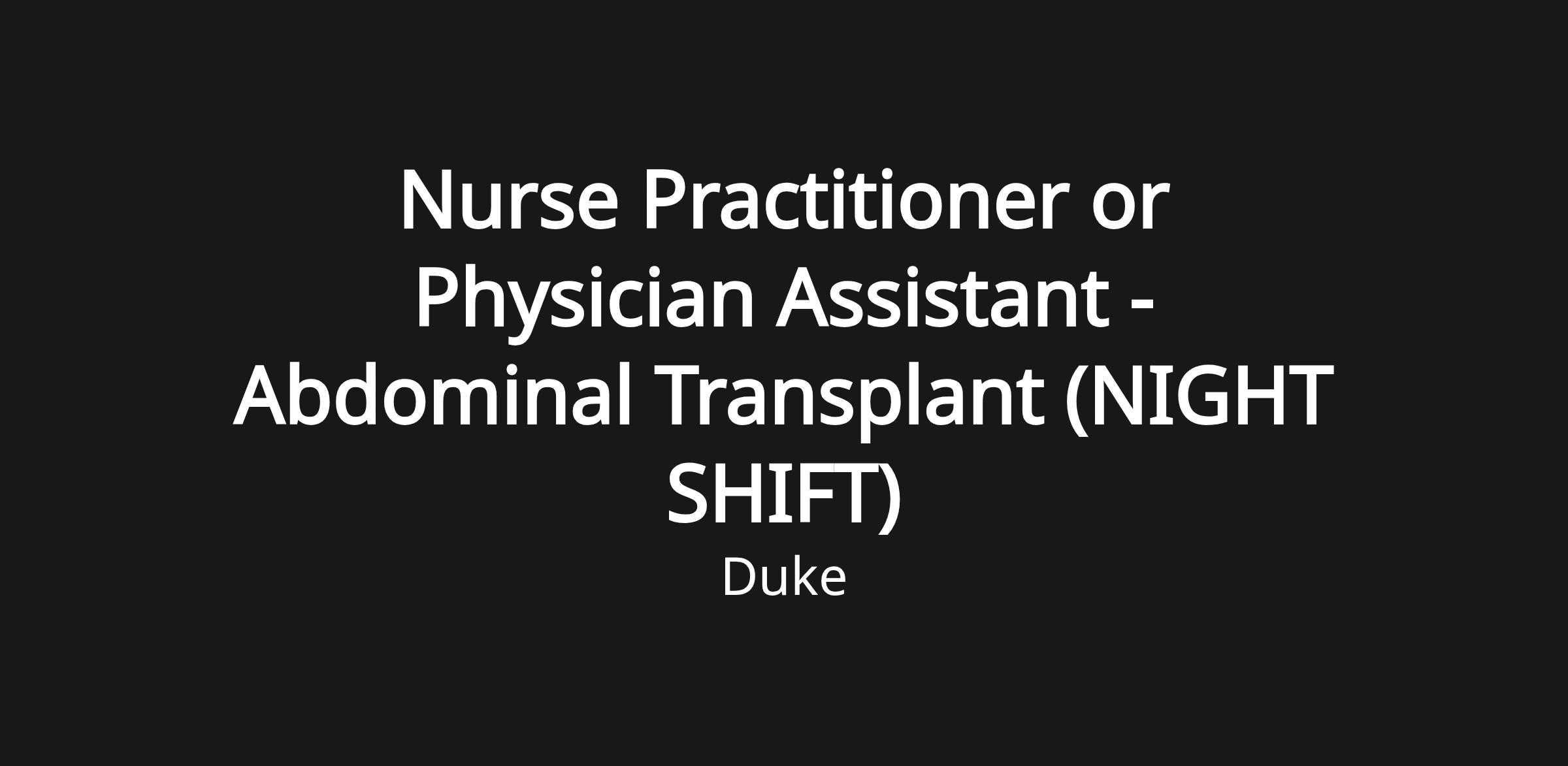 The Duke Abdominal Transplant Surgery Hospitalist Advanced Practice Provider (NP or PA-C) provides direct patient care services for surgically and medically ill adult transplant and general surgery patients in Duke Hospital, in collaboration with physicians. The NP or PA performs physical exams, collects and documents data, conducts diagnostic and therapeutic procedures, orders and schedules laboratory studies and professional consultations, prescribes appropriate interventions and medications, coordinates the care and discharge of patients, may assist in the operating room and provides direct patient care services. The Nurse Practitioner or Physician Assistant contributes to excellence in patient care, research, teaching and provides leadership in the organization. This position has no operating room responsibilities.