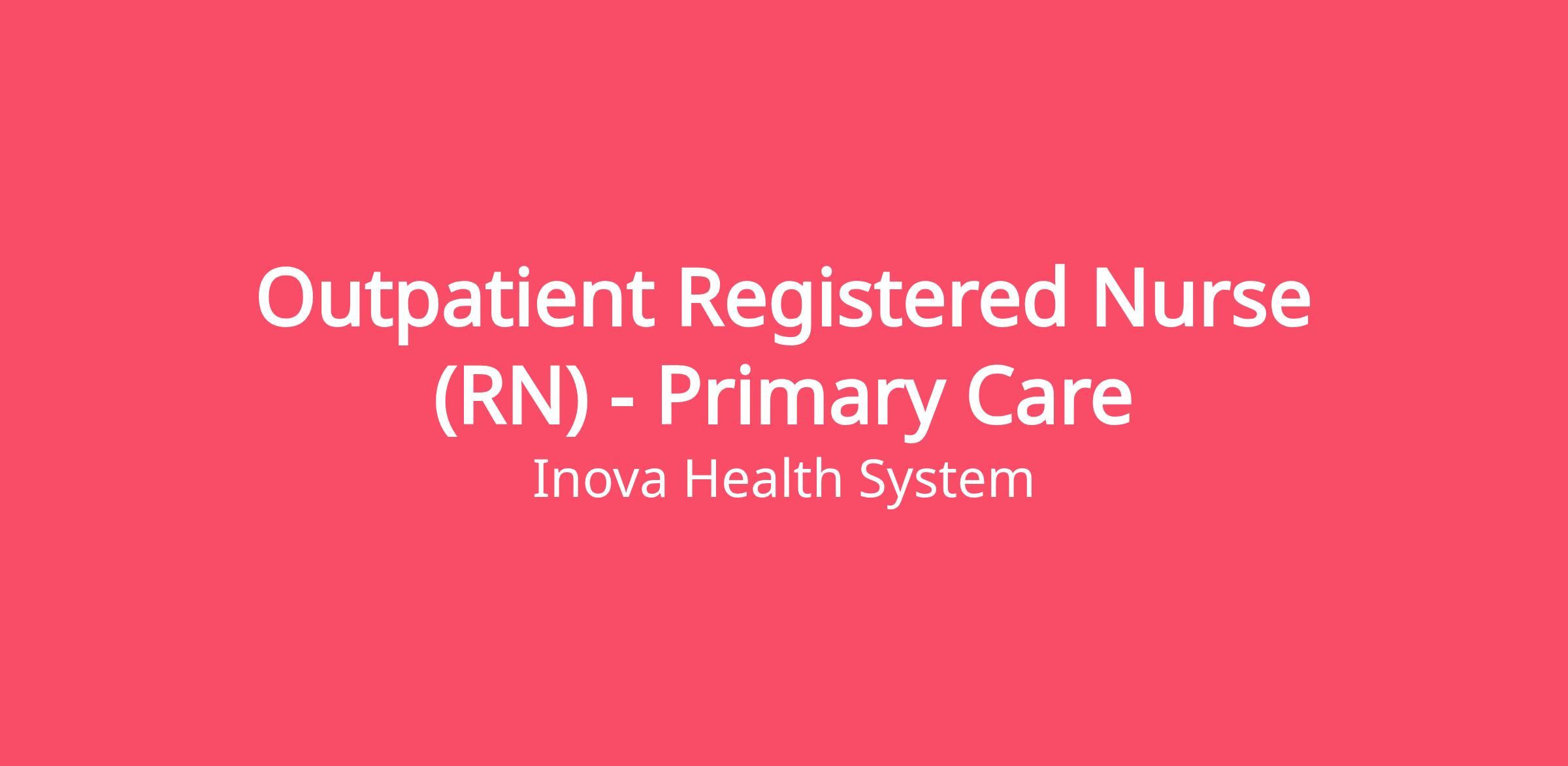 DescriptionInova Primary Care - Sudley is looking for a dedicated Outpatient Registered Nurse (RN) to join the team. This role will be full time day shift from Monday – Friday, 8:00am – 4:30pm.