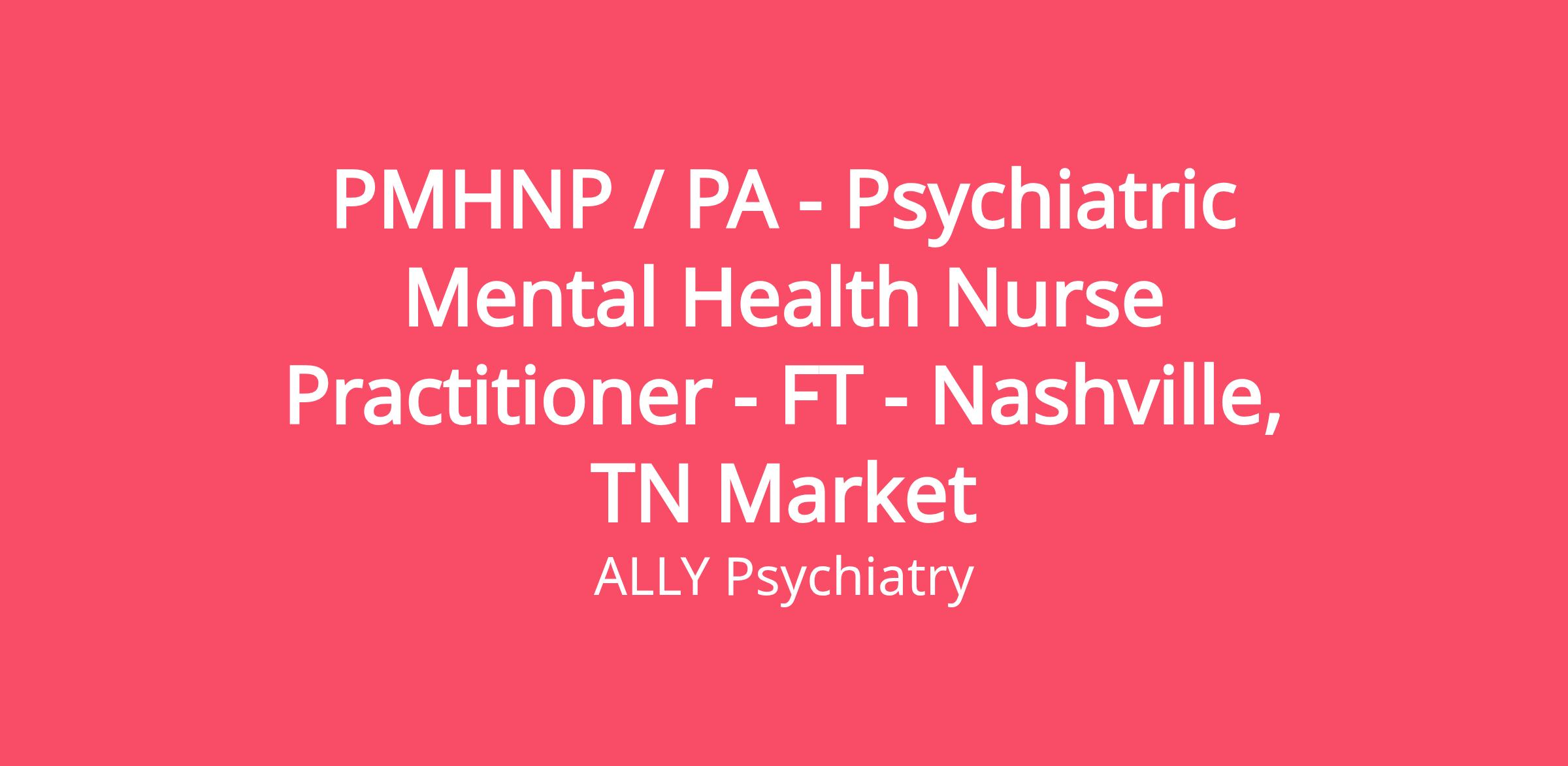 Ally Psychiatry is looking for a compassionate and motivated Psychiatric Mental Health Nurse Practitioner or Psychiatric Physician Assistant to join our growing team in beautiful Nashville, TN.