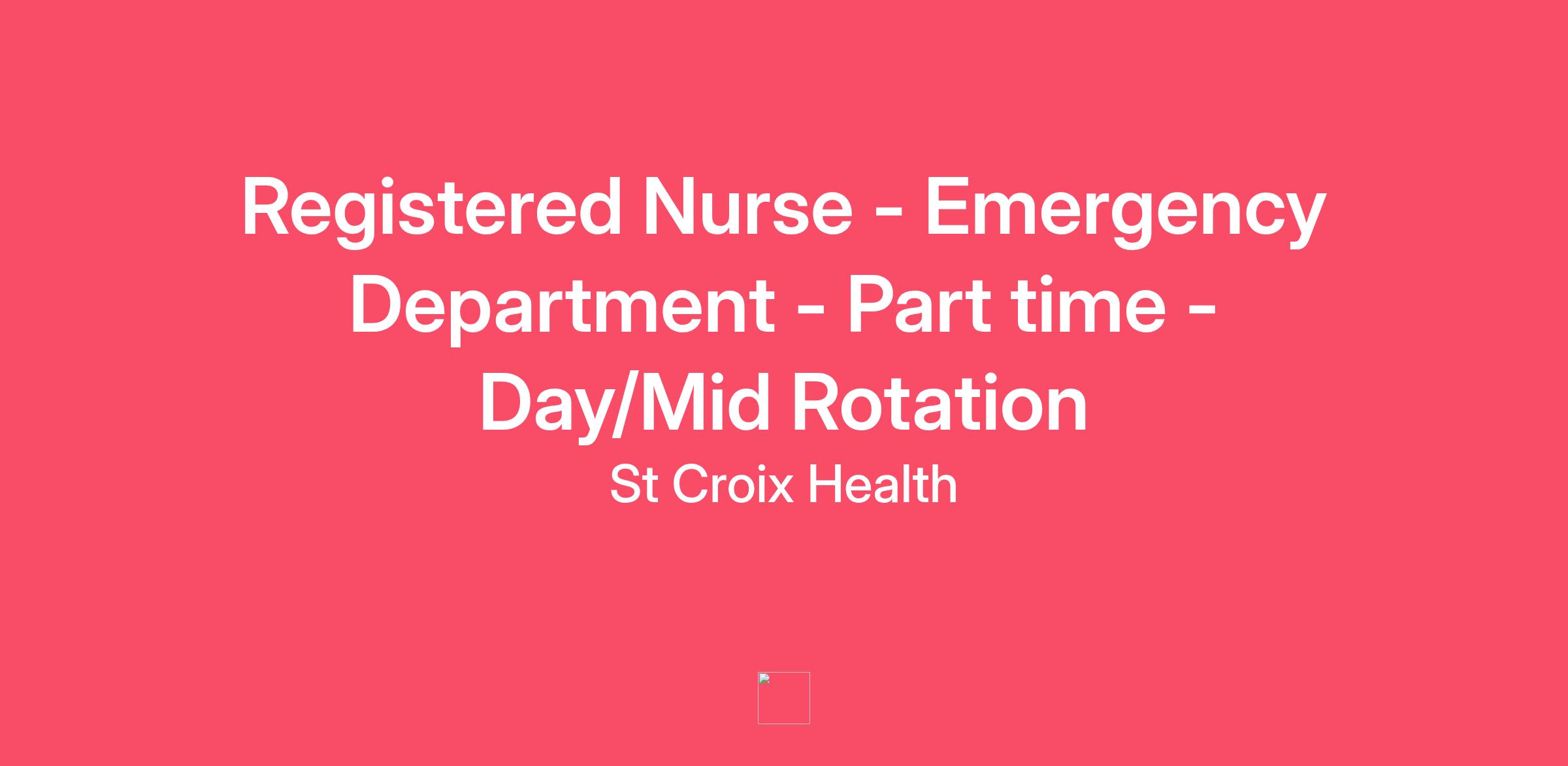 St. Croix Health is currently seeking a scheduled part-time (0.6 FTE) Emergency Department Staff Registered Nurse to join our team. This position will work a combination of day shifts (7 am - 7:30 pm) and mid-shifts (11 am - 11:30 pm). Schedule will include every third weekend and holiday.