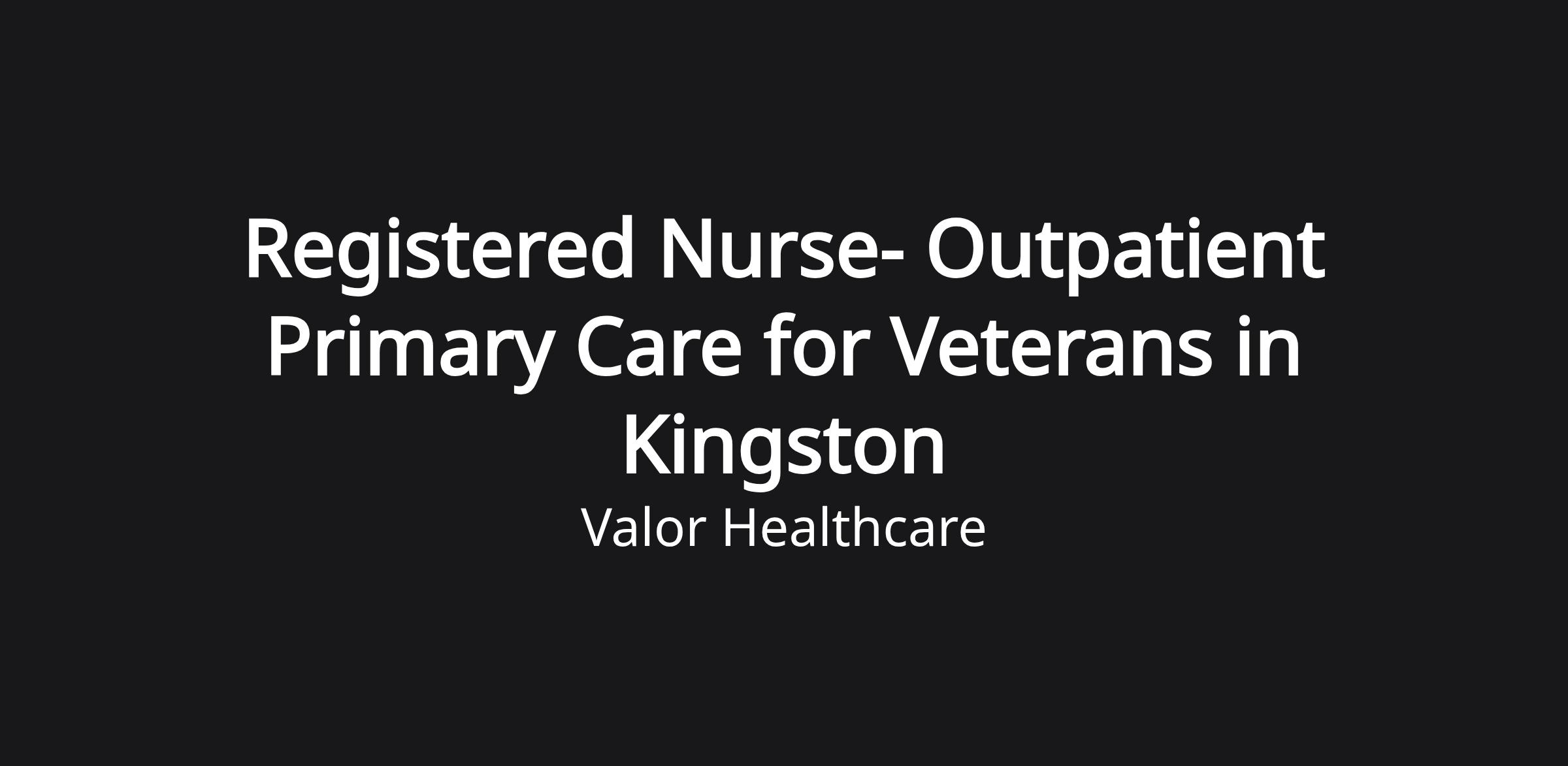 Valor Healthcare is looking for a passionate Registered Nurse to join our team at the (location) Community Based Outpatient Clinic (CBOC) in Kingston. In exchange for your dedication and experience, we are proud to offer a competitive salary, excellent benefits, generous time off and a weekday schedule.
