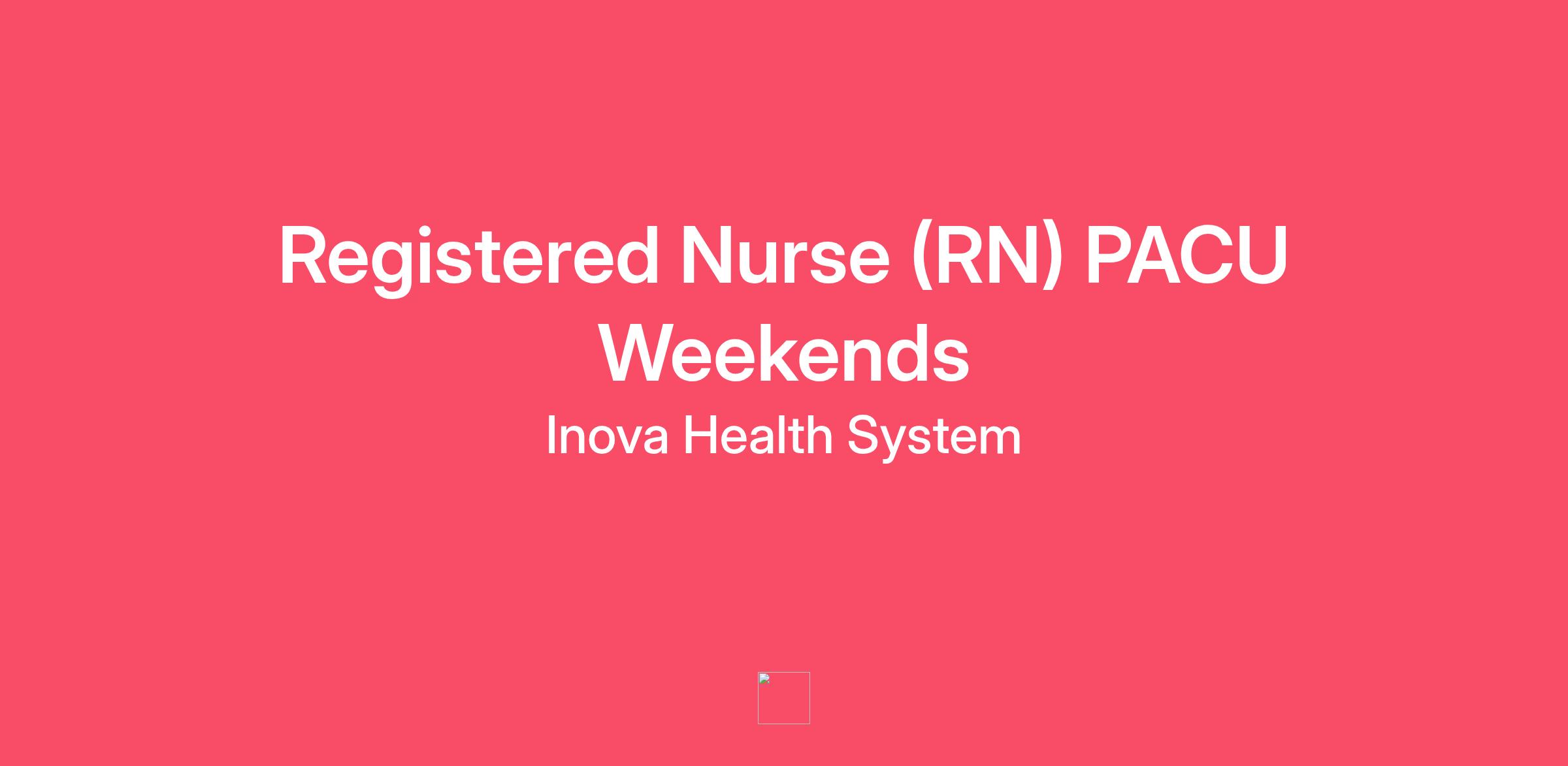 Inova Alexandria hospital is looking for an experienced Perianesthesia (PACU) Nurse for a full time Day Shift Weekender position. Inova’s Perianesthesia RNs work pre and post op; Phase 1 and 2. Must be able to work full time: three consecutive 12-hour shifts (Fri-Sat-Sun or Sat-Sun-Mon), totaling 72 hours per pay period. There is a premium weekend differential for this schedule.