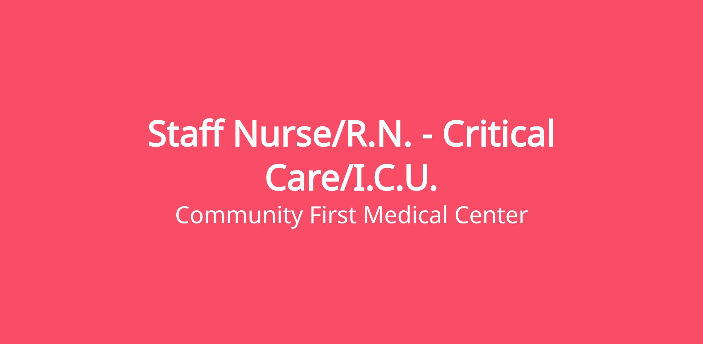 Community First Medical Center is an affirmative action/equal opportunity employer who is committed to cultivating diversity, equity and inclusion within all aspects of our organizations. We stand against and prohibit discrimination in hiring or employment on the basis of age, sex, race, color, religion, national origin, gender identity, veteran status, disability, sexual orientation or any other protected status